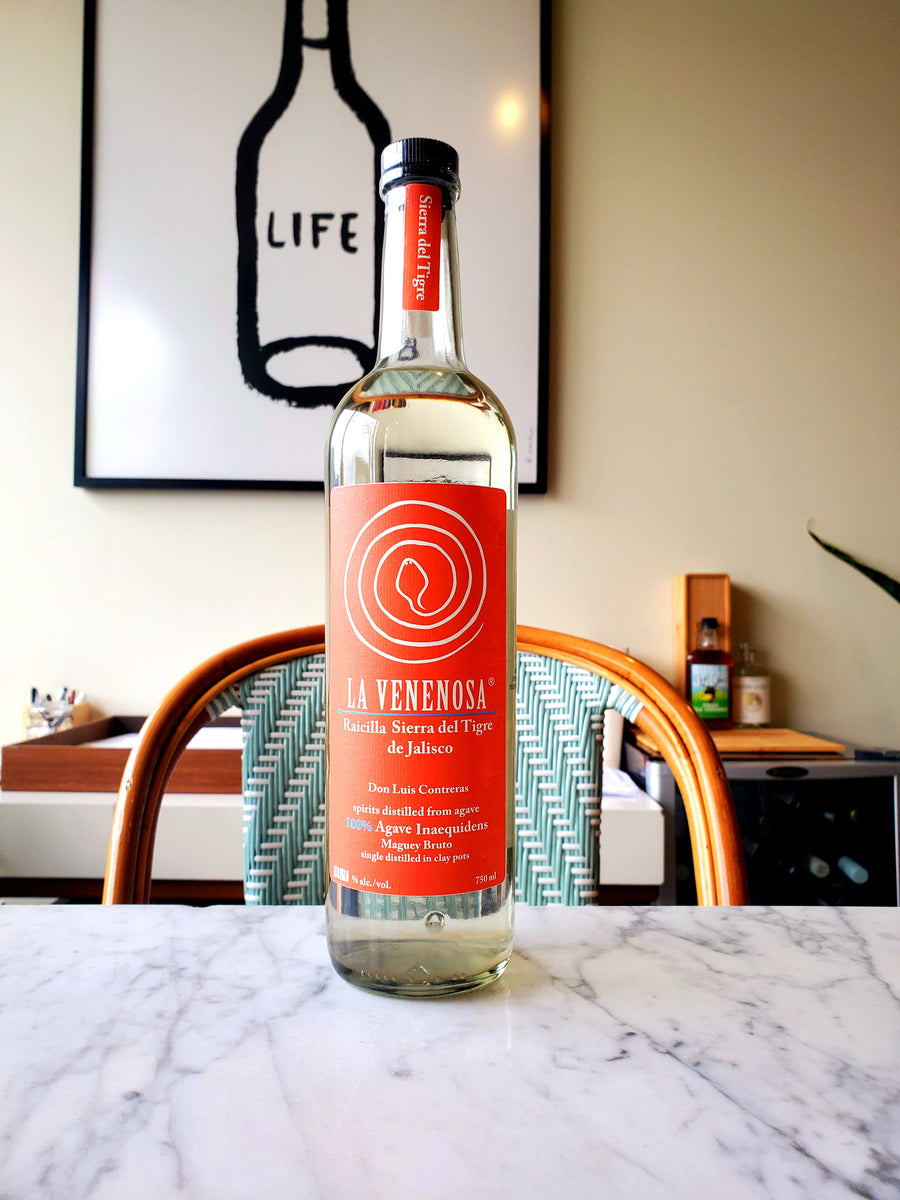 Unlike Mezcal, Raicilla is never smoky, but has complex savory and fruit notes that set it far apart from Tequila and other Agave distillates. La Venenosa's orange label, Sierra del Tigre, has a big nose full of sagebrush, petrichor, and aged cheeses, with an exceptionally lush and creamy palate replete with lactic notes and citrus, leading into minerality and deep spice emerging from the depths of this rare spirit. Even at a high proof, Sierra de Tigre drinks as easily as desert rainwater, if desert rainwater tasted like spicy cheese and snake venom.